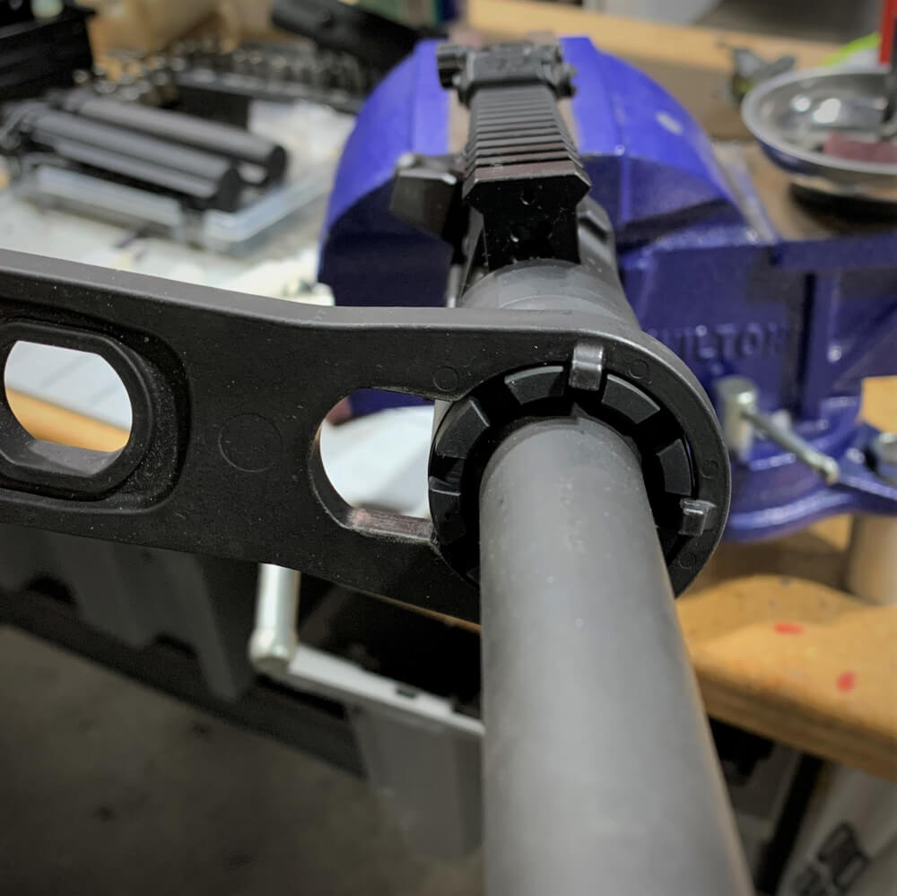 ADM Recommends the Magpul Armorers Wrench for the installation of our handguards. You will use the castle nut end of the wrench for installing the ADM barrel nut. Please ensure you have full teeth engagement on the barrel nut to prevent damage. Reference the photo below.