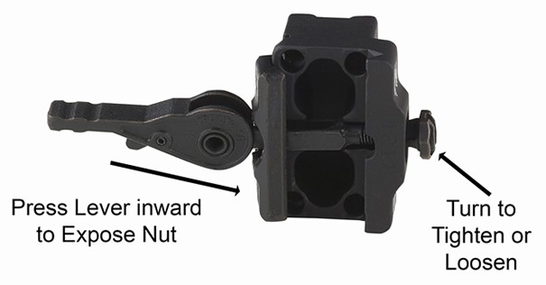 We recommend the tension on the throw lever to be set tight enough to secure the mount to the rail without any movement, but not so tight that you have to pry the throw lever open with a tool to remove the optic from the firearm. This is set by adjusting the tension in with the adjustment nut. You will want to feel resistance on the throw lever at about the 2/3rds closed position. Please ensure that the flats on the adjustment nut line up with the adjustment nut pocket in the mount itself. If the flats on the adjustment nut are not lined up correctly, the adjustment nut can become wedged in the pocket and seize up. To un-seize the adjustment nut, you will need to open the throw lever assembly completely and tap the throw lever with a rubber mallet. This will un-stick the adjustment nut from the pocket and allow you adjust the mount tension.