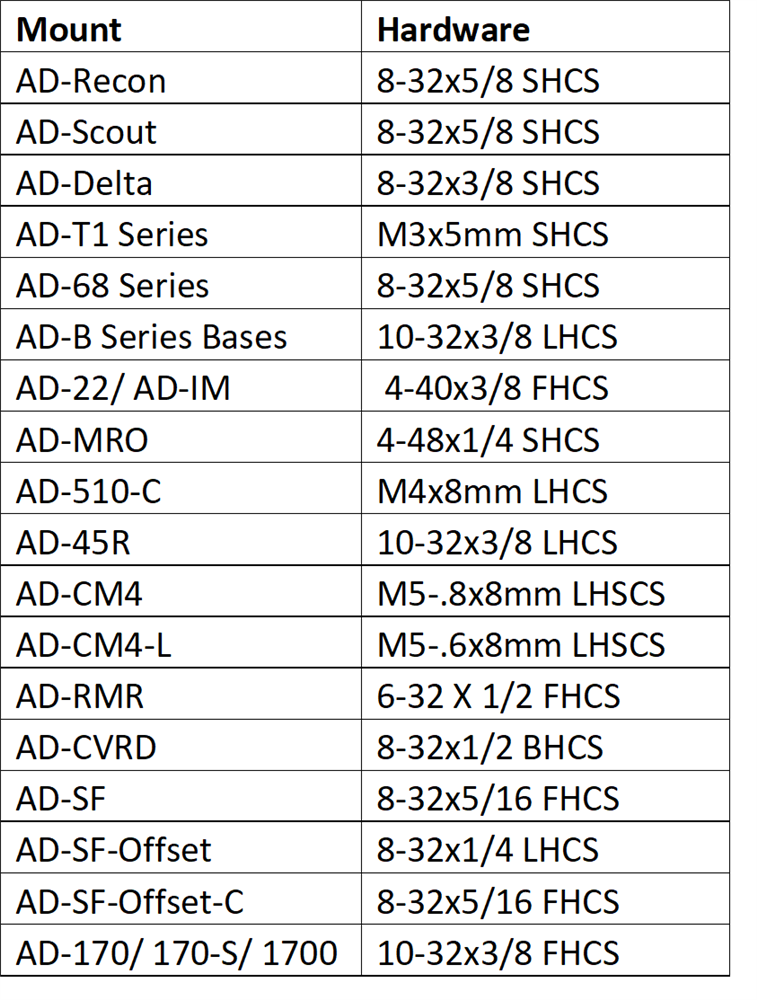 We are now including 2 sets of screws with all Aimpoint T1/T2 mounts. The short screws are for our one piece mounts. The Middle length screws are to be used with our 2 piece modular risers as well as mounting the Aimpoint T2 on one of our one piece bases. ( The T2 requires the use of longer screws for proper thread engagement. )The longest length are to be used with our two piece risers with the Aimpoint T2 optic. If you are using a Vortex or Holosun optic we recommend trying the short-size screws and seeing if they securely affix the optic to the mount if not then moving up or down to the other screws if necessary. There is no torque rating for these screws, we recommend tightening them hand tight. Customers have damaged their optics in the past trying to torque the screws down to a specific number.